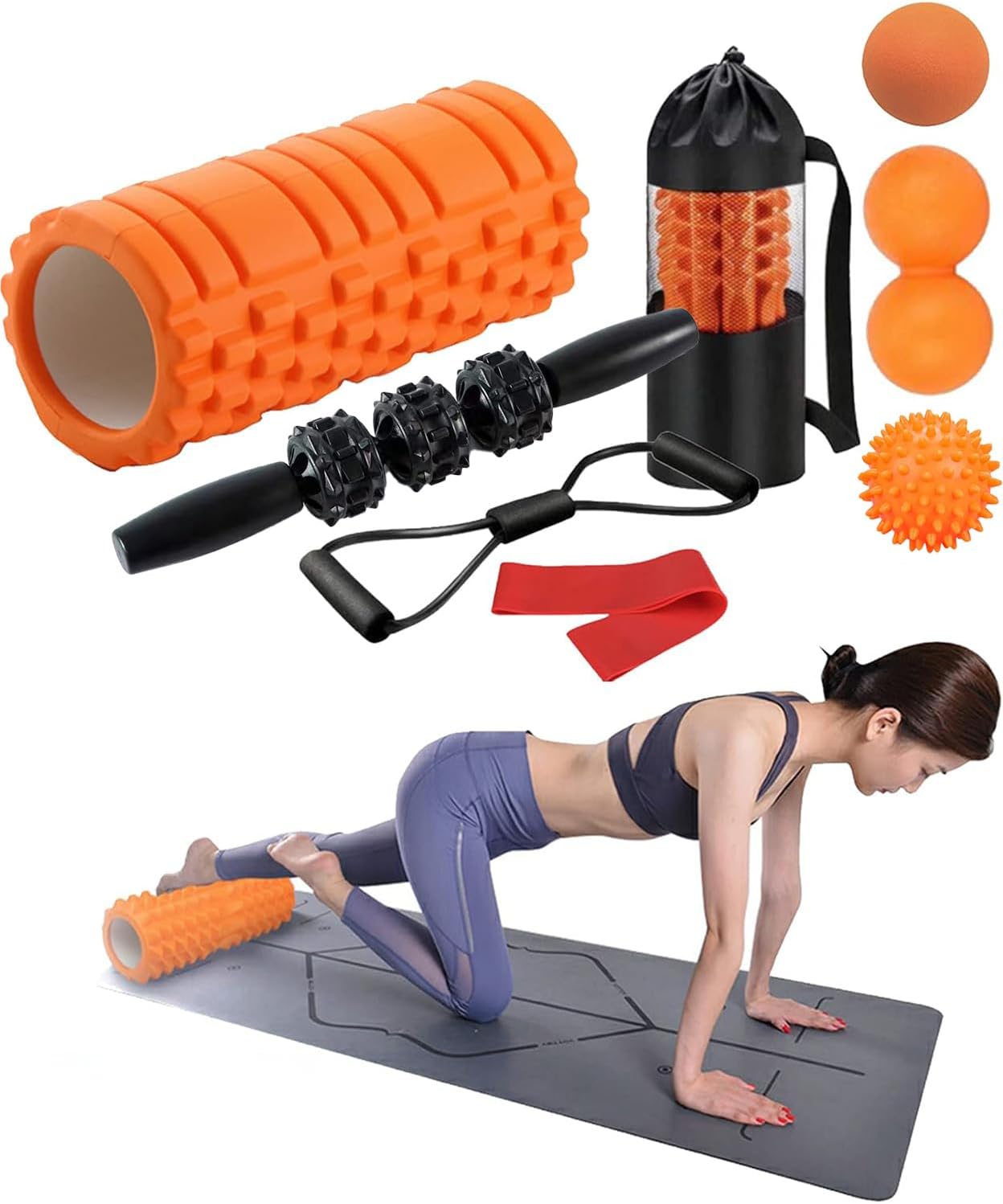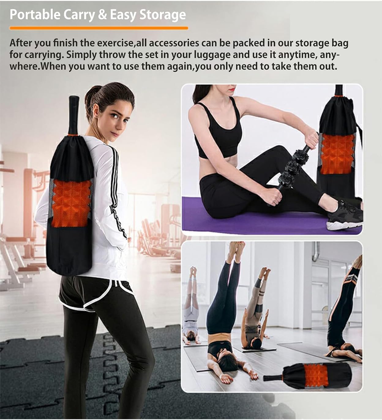 Experience complete muscle relief with the Kinmakura 8-Piece Body Roller Set, designed for deep tissue massage, stretching, and pain relief. Perfect for yoga, gym workouts, travel, and home use, this set includes a foam roller for targeting the back, legs, and thighs, a muscle roller stick for arms, calves, and quads, a peanut ball for focused relief on the spine and neck, and a spiky massage ball to stimulate circulation and relieve tension. The set also features stretching and exercise bands to enhance flexibility and mobility, a massage ball for easing knots and tight muscles, and a storage bag for convenient travel and easy storage.